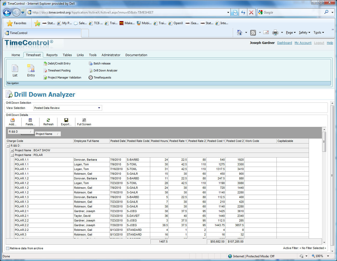 TimeControl's Drill-Down Anaylzer is a powerful method of making rapid queries of the TimeControl posted or unposted data. The system presents a preselected list of fields and the ability to add additional fields or additional pre-defined lists. A long optionally filtered list of data is presented in a spreadsheet format. Then, when the user drags any column to the summary bar, the data instantly groups and summarizes by that field. Add a second field and it makes a sub-group. Add a third and there's an instant third level of summary. It has to be experienced to get the full impact so take a quick look at our Online Video lesson on the feature. Drill-Down Analyzer views can be printed or saved as XML or Excel files for additional use.